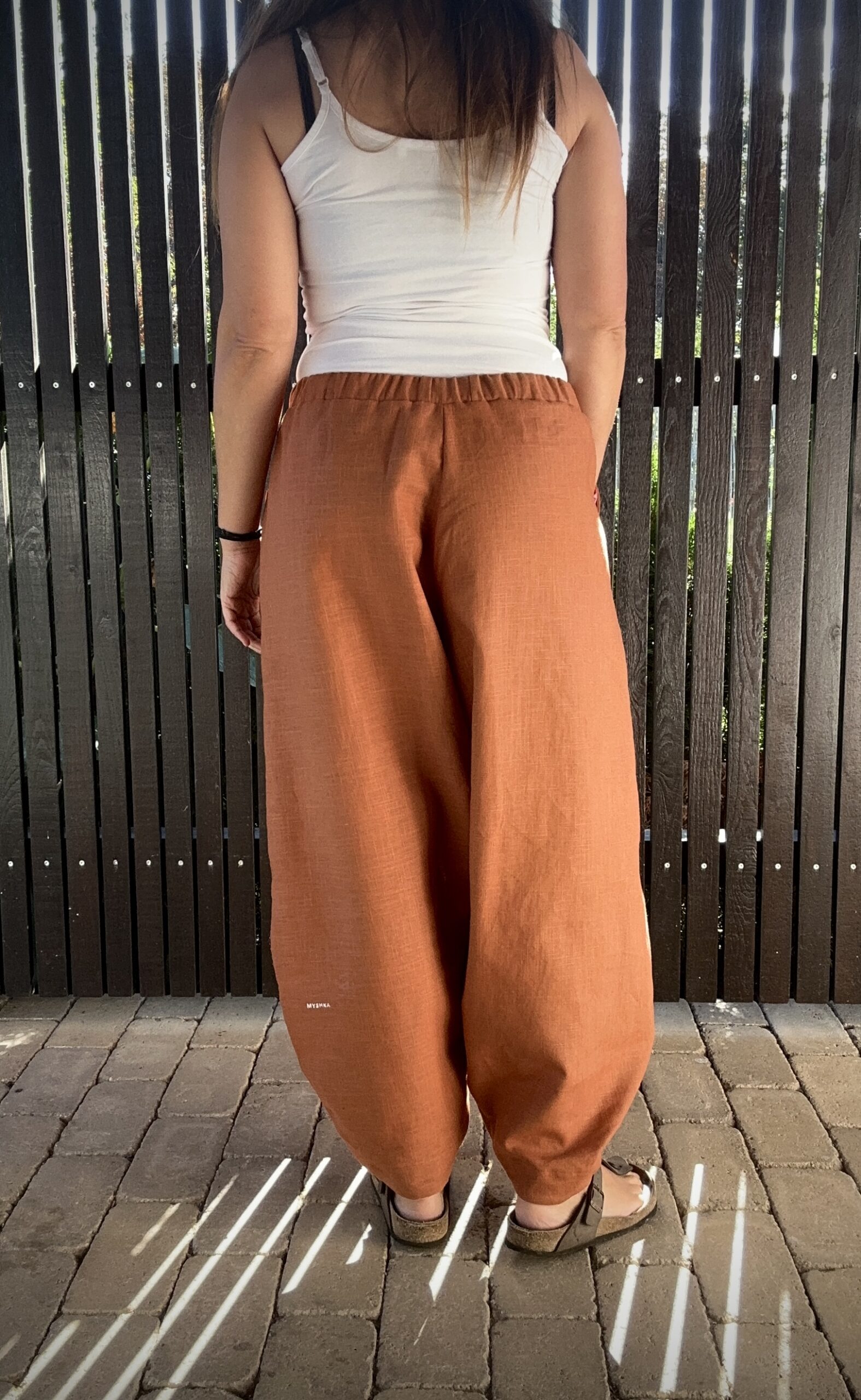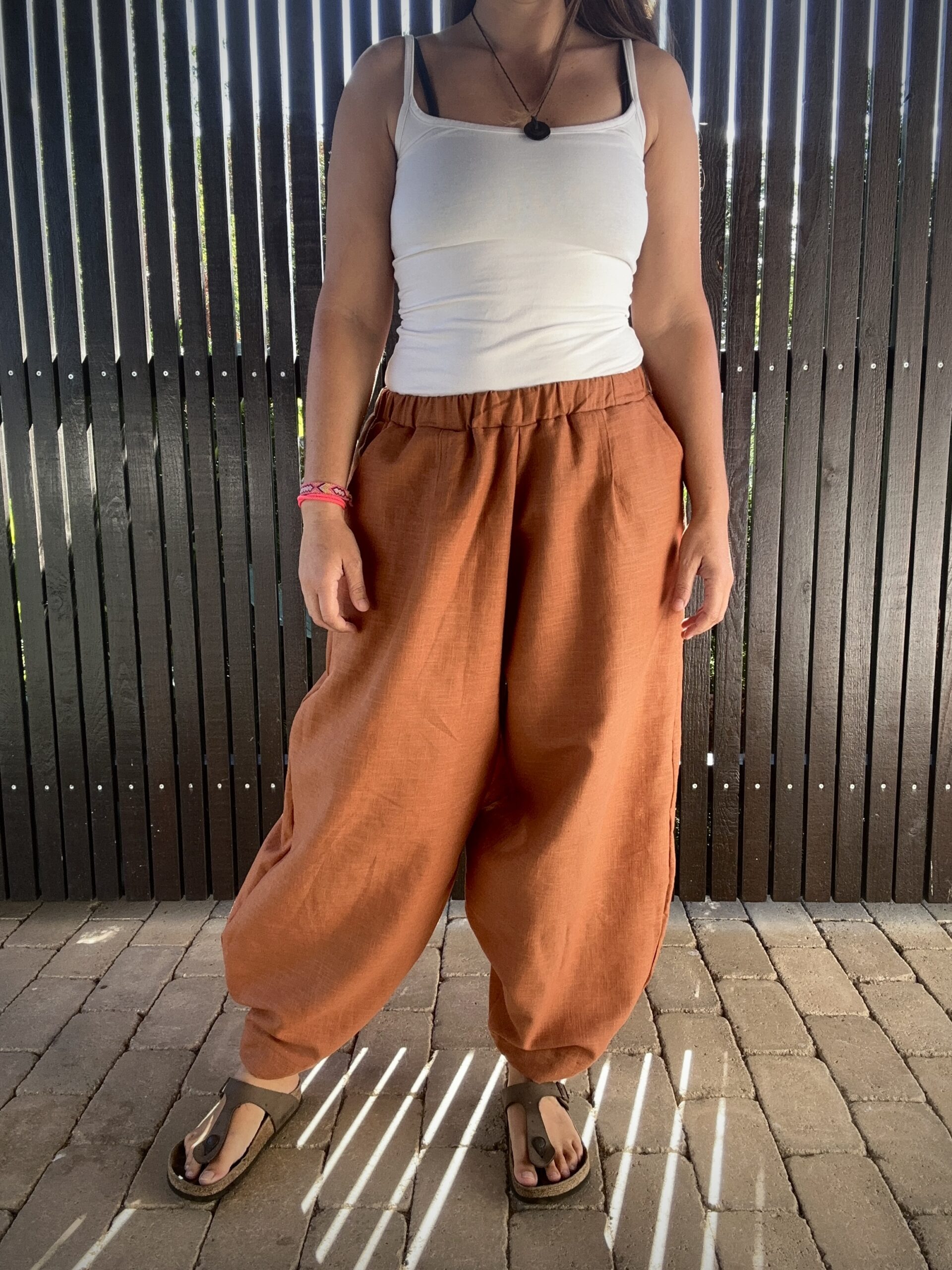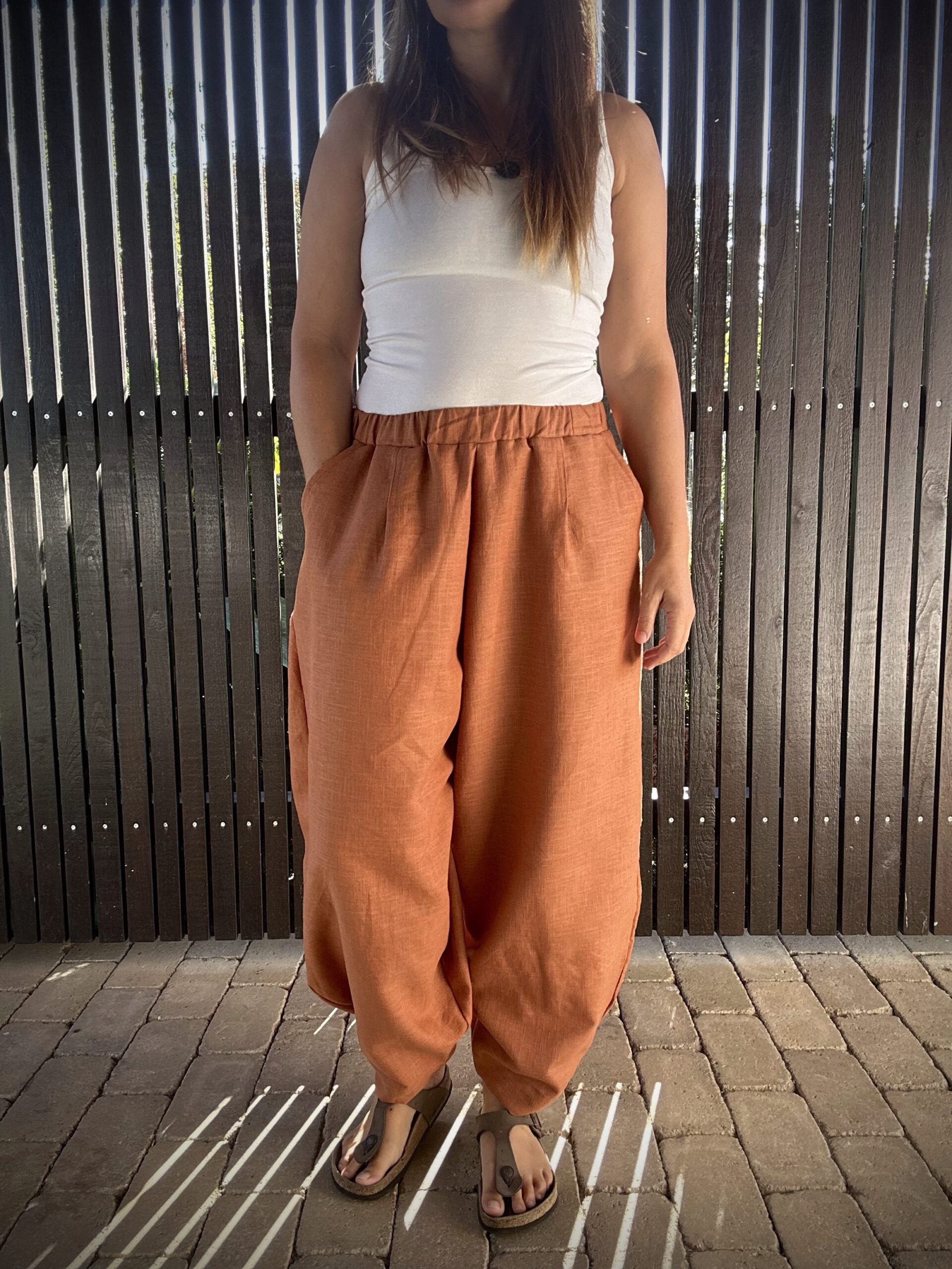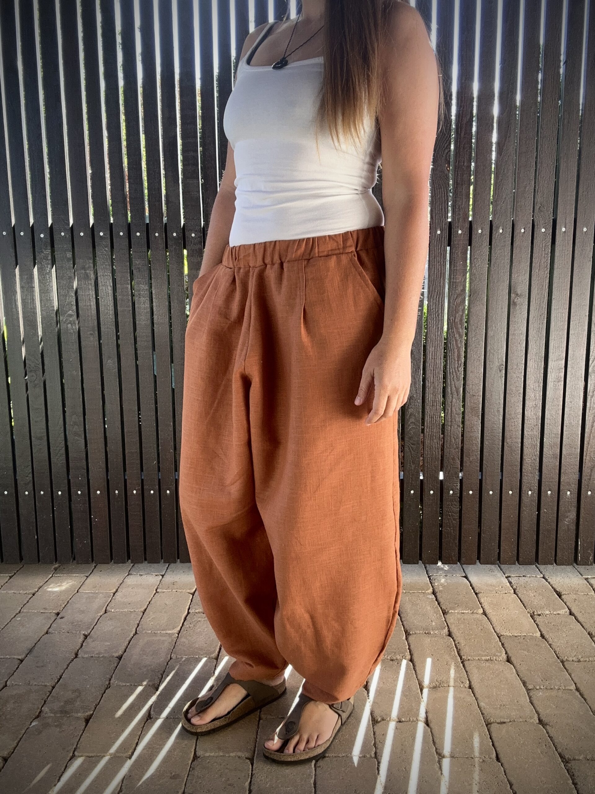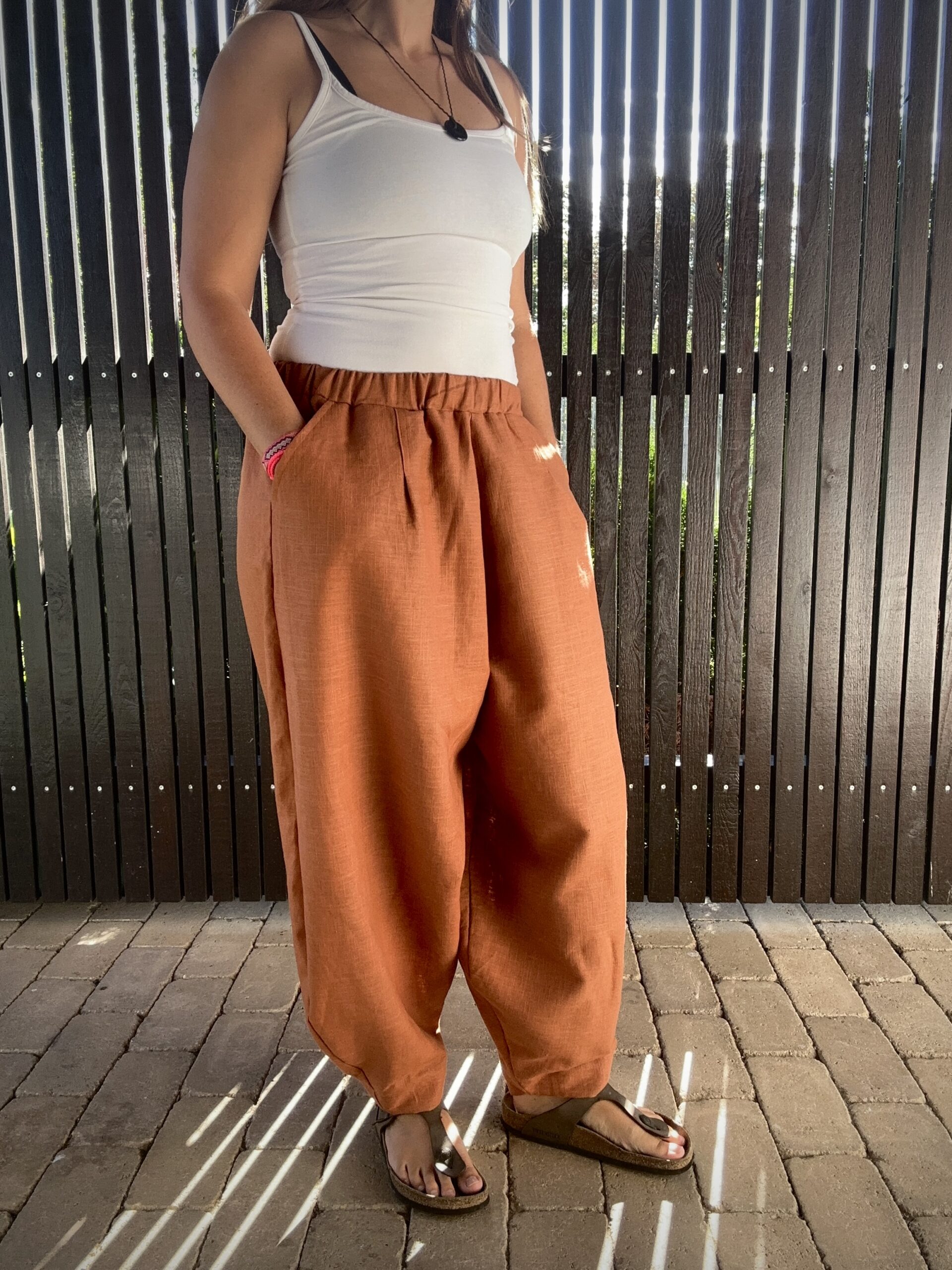 Pohodlie na maximum! Vďaka svojmu extra voľnému strihu sa v nich budete cítiť naozaj komfortne. Tieto nohavice sú ušité z prírodného ľanu, vďaka čomu vás v lete príjemne chladia a dovoľujú pokožke dýchať. Tento parádny balónový strih šikovne skryje, čo má, a dodá vám ležérny a trendy vzhľad. Sú široké na bokoch a jemne stiahnuté dole, majú pás bez kompromisov na gumu a dve priestranné vrecká. Čím viac ľan nosíte, tým je jemnejší a mäkší. To všetko robí z týchto rafinovaných nohavíc parádneho spoločníka či už na cestovanie, jógu, alebo na kávu do mesta.